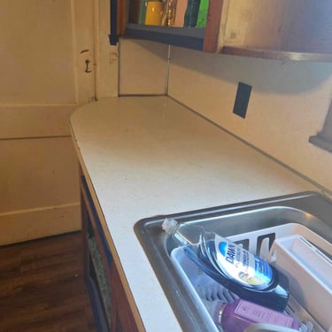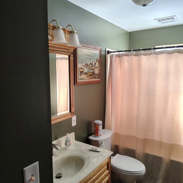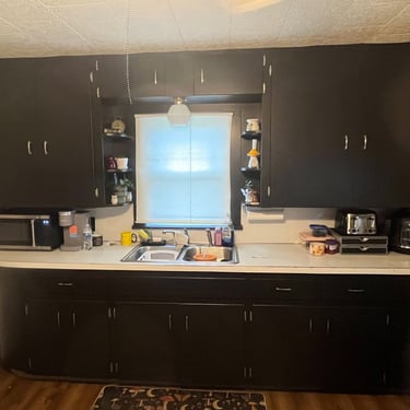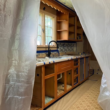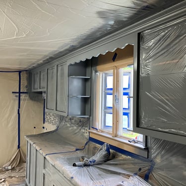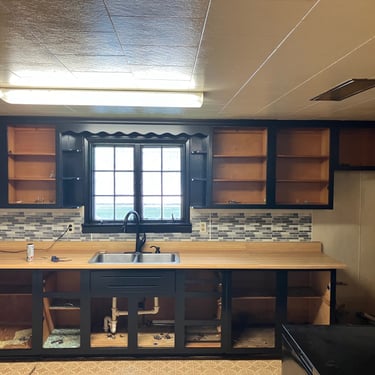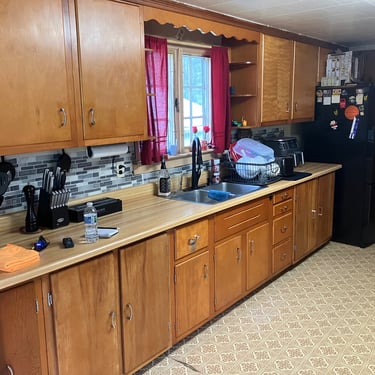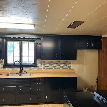 Cabinets were old pine but have been modernized with a low sheen finish.